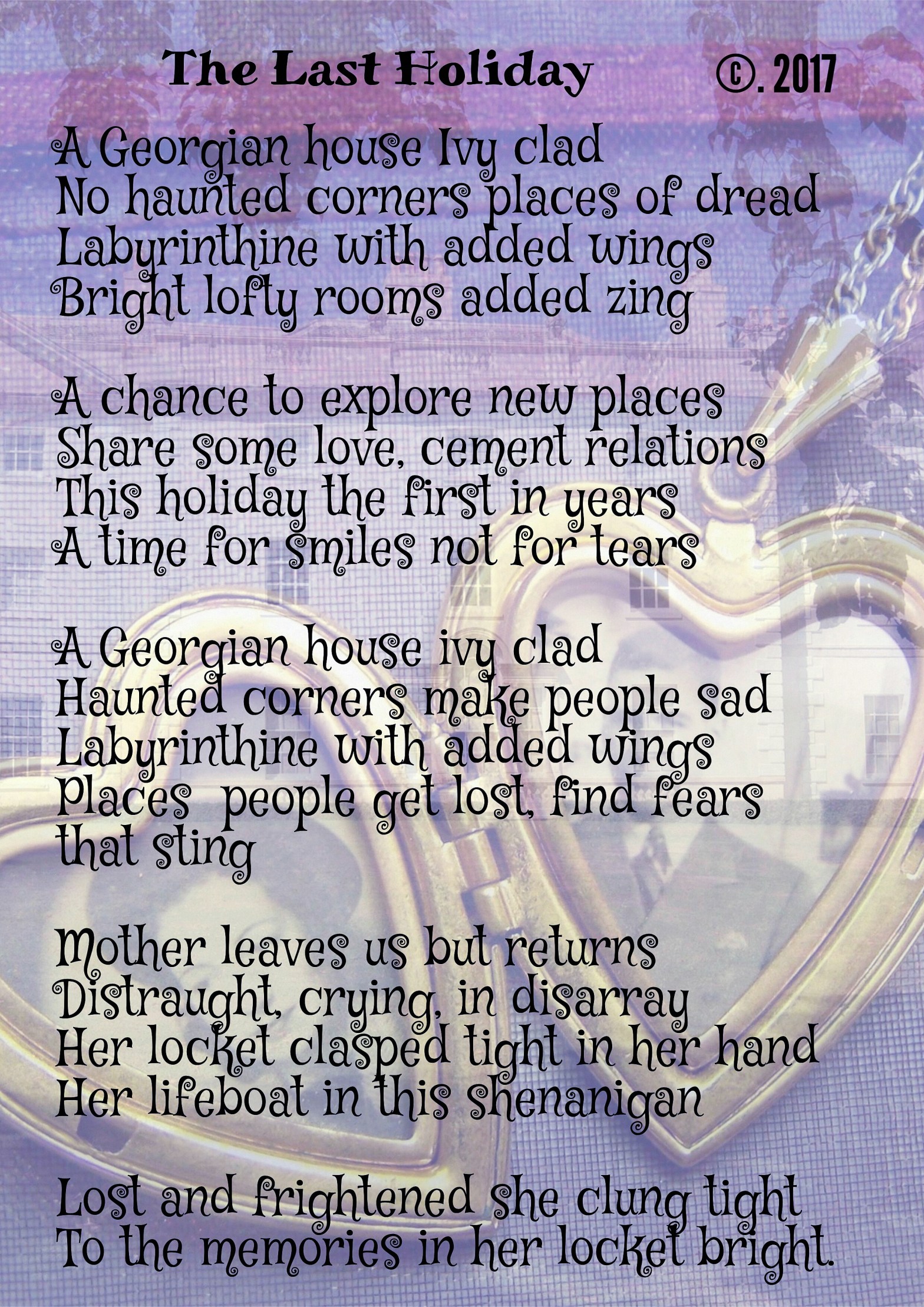 A Georgian house Ivy clad No haunted corners places of dread Labyrinthine with added wings Bright lofty rooms added zing A chance to explore new places Share some love, cement relations This holiday the first in years A time for smiles not for tears A Georgian house ivy clad Haunted corners make people sad LabyrinthineContinue reading “The Last Holiday”