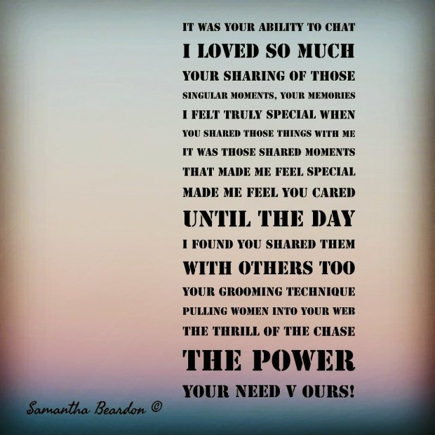 Some people chat on line to get to know people make new friends. Some do it boost, their egos to have a virtual affair, to exert their power, to chase capture and discard. Be wise, hold on to your heart, too good to be true? It probably is!