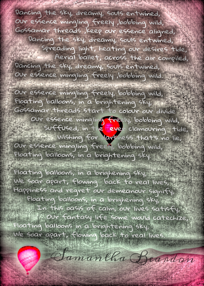 The poem is comprised of three line stanzas, and each line has a rhyming word in the seventh position. A three syllable caesura is added to line #1, which cross-rhymes with the first three syllables of line #2.